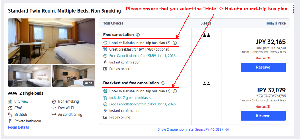 Please ensure that you select the "Hotel ⇔ Hakuba round-trip bus plan" (see photo).