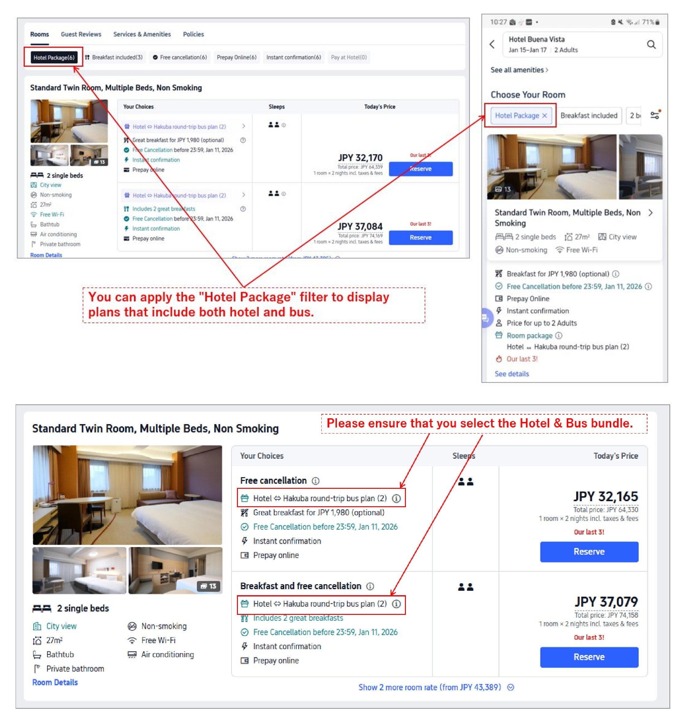 請務必確認您選擇的是「飯店+來回巴士專案」(請參考照片)。